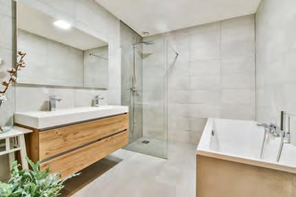 Incorporating matte black fixtures such as faucets, handles, screens, doors and showerheads can further enhance the cohesive look. Finish with pops of green and brass accents.