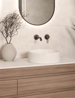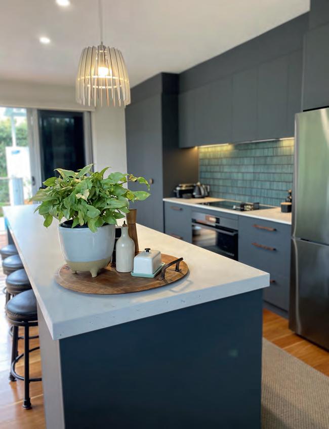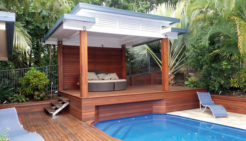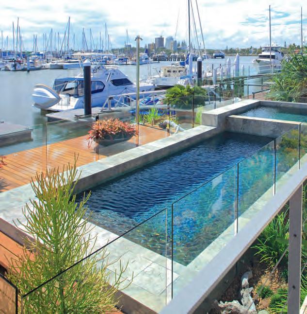 Pale stone coping provides a timeless fi nish, while timber decking adds warmth and slip resistance. For a lower-maintenance alternative, composite decking delivers the same clean lines without the need for regular oiling. The mix of textures creates a resort feel that’s also practical.