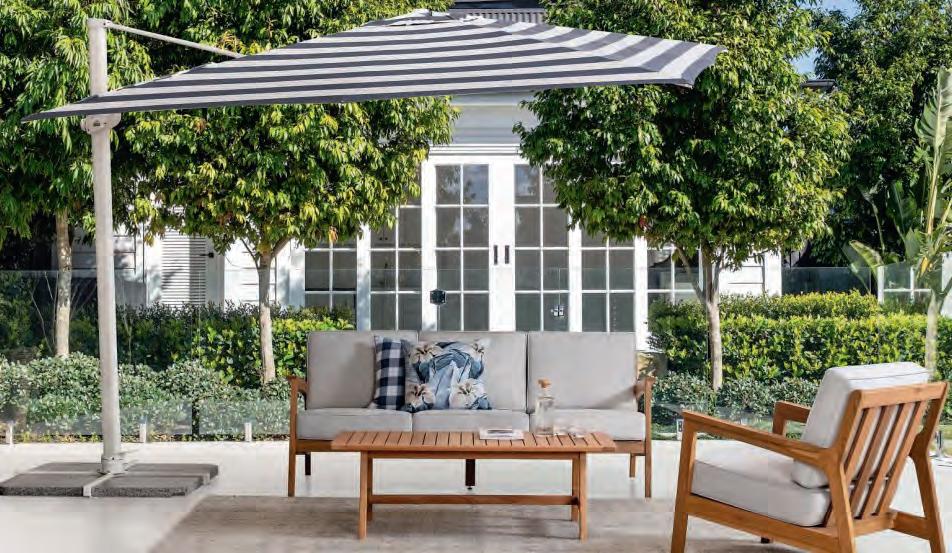 Bring a little of the European summer to your home with the navy and white Rialto 300-centimetre square cantilever umbrella. It’s from Domayne, Maroochydore Homemaker Centre