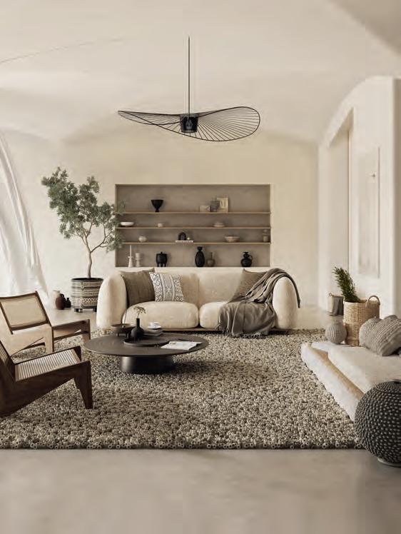 Solstice is a toasty palette of rich browns, clay and warm neutrals with a sun-loving yellow as an accent, designed to evoke a comforting, familiar and inviting feeling. “Sun-soaked neutrals are influenced by a soft orange glow and paired with softer shades of pastel blues and citrus yellow,” explains Andrea. “This trend embodies a harmonious blend of cosy and calm styling elements, with captivating material highlights like natural stone, ceramic and highly textured fabrics.”