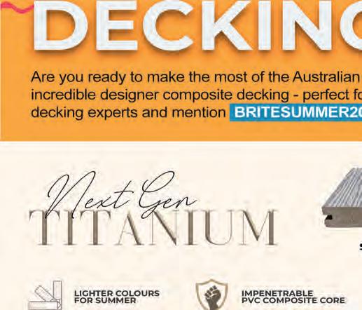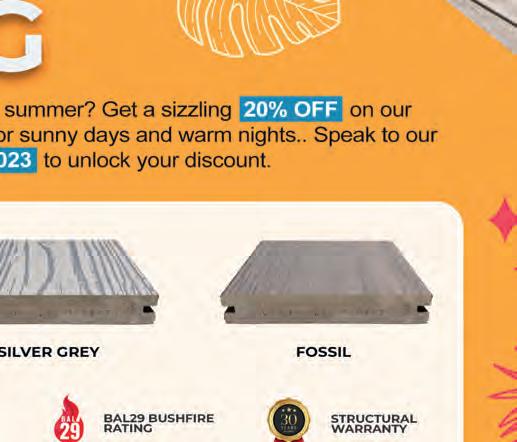 25 My Renovation | October 2023 PHONE TODAY 5493 7872 1/28 Ron Parkinson Cres. Bells Creek QLD 4551 www.metroll.com.au | sunshinecoast@metroll.com.au COLORBOND® steel, the BlueScope brandmark and ® colour names are registered trademarks of BlueScope Steel Limited. “The colours of Australia since 1966®” and ™ colour names are trademarks of BlueScope Steel Limited. © 2021 BlueScope Steel Limited ABN 16 000 011 058 All rights reserved YourLocal COLORBOND® Experts Theteam Sunshine Coast families turnto Locally focussed service backed by one of Australia’s largest building groups COLORBOND® Fencing Patio & Shed Kits Rain Water Goods DOVER WHITE® SOUTHERLY® BLUEGUM® NEW COLORBOND® steel colours available! Timber & Landscaping Supplies Cnr of Production & Bearing Ave Warana Ph: 5493 8022 lifetimetimbers.com.au