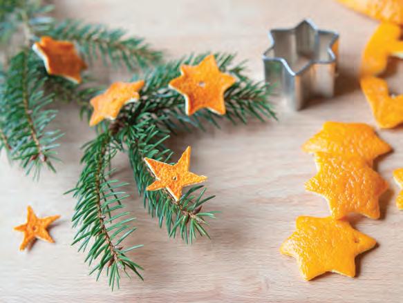 Materials: foraged treasures, recycled strips of fabric or ribbon, food items such as pasta bows, cinnamon sticks, dried citrus slices, pretzels or popcorn (plain popped), rosemary sprigs, twine or raffia, large-eyed needle (plastic ones available for small fingers) and cotton thread, plus glue.