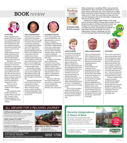 TONY HARRINGTON This book is not a literary masterpiece but a great little true story of an ex-pat Australian ultramarathon runner and a small dog who adopted him during a race in the Gobi Desert. Dion had a difficult and painful childhood with the death of his stepfather and a lack of love from his mother. Due to these troubles in his early life he has the ability to switch off pain, doubt and fear which gives us some insight into why he can run 155 miles in extreme desert heat. He sacrifices his place in the race to help another runner and the little dog Gobi. Gobi and other dog loving Chinese folk help Dion change his outlook on life. Finding Gobi helps him find his better self and he changes from being a self-centred loner to an other-centered caring person, and the world to a loving and kind place. This is a must read for all animal lovers, 8/10