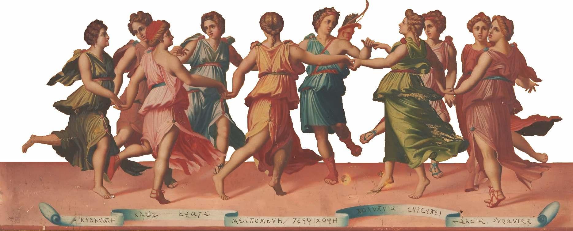 penalis zedapirze zemodan qvemoT, sam rigad gamosaxulia muza-qalRmerTebi – klio, evterpe, Talia, melpomene, terfsiqore, erato, polihimnia, urania, kaliope, Sesabamisi berZnuli warwerebiTa da im atributebiT, rac antikur ikonografiaSia miRebuli