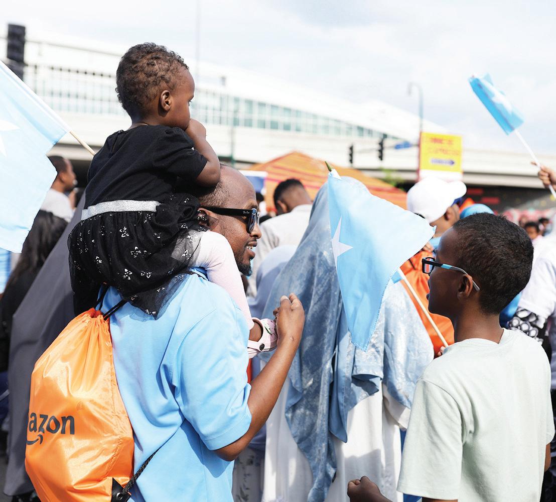 in Minneapolis to celebrate Somalia’s Independence Day. Waving a sea of sky-blue flags, people surrounded the stage on Lake Street, where a lineup of musical artists was scheduled to perform. Further from the stage were Somali business vendors, their tents sheltering them from the oppressive heat. Children’s laughter could be heard over the traditional Somali music playing on the speakers. Attendees enjoyed a range of activities including a petting zoo, face painting, and treats.
