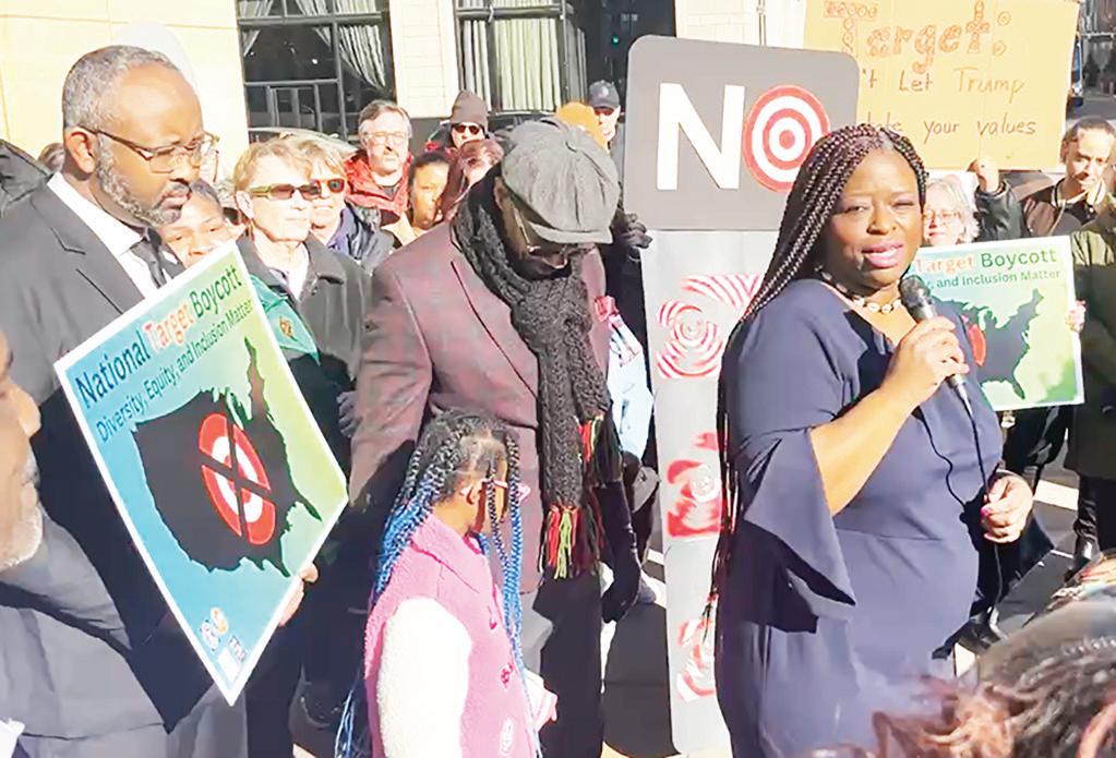 Civil rights attorney Nekima Levy Armstrong speaks during a press conference outside of Target headquarters in downtown Minneapolis on Jan. 30, 2025 calling for a boycott of the retailer. Photo: KingDemetrius Pendleton/ListenMedia USA Livestream Screengrab
