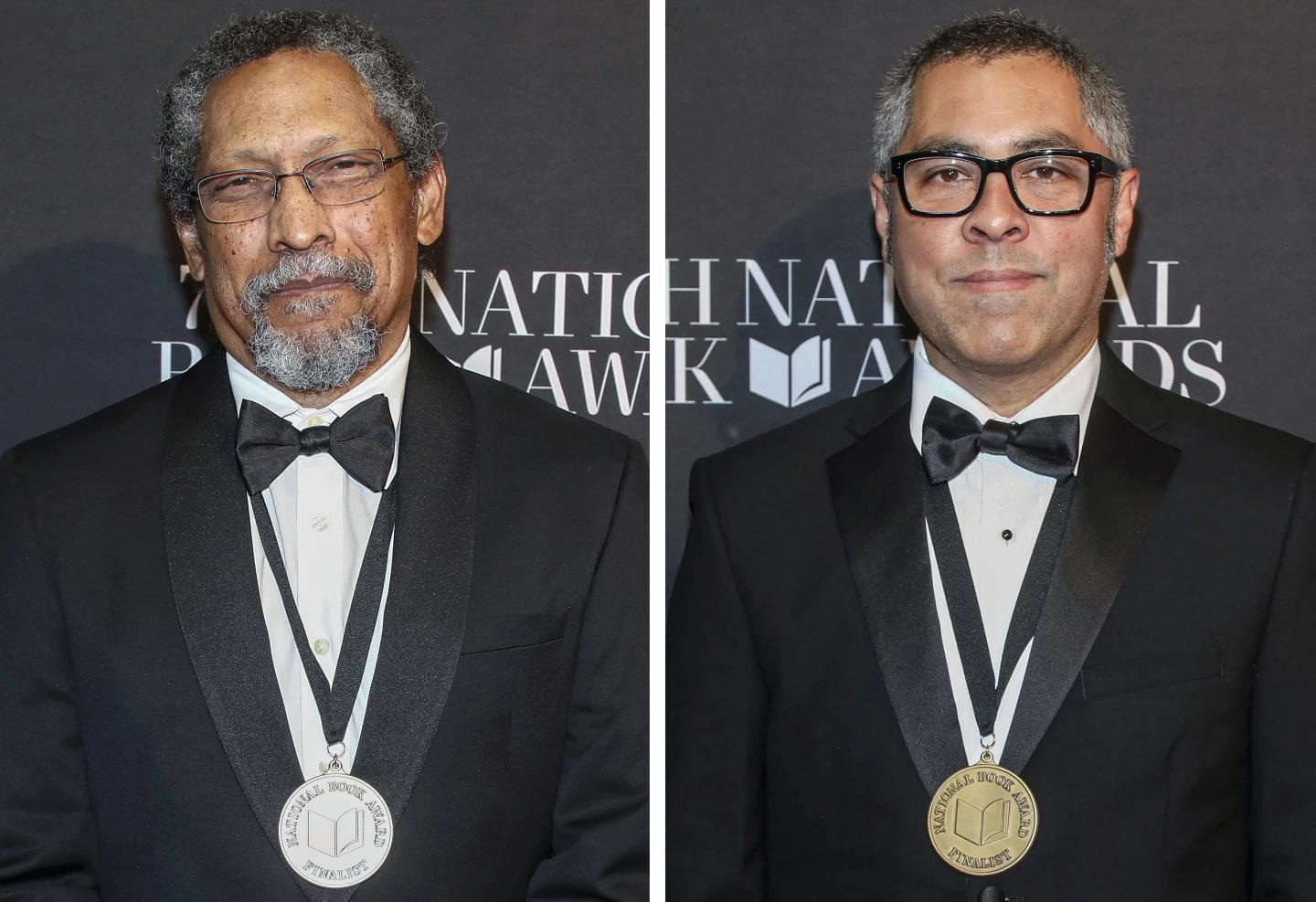 This combo image shows authors Percival Everett, left, and Jason De Leon as they attend the 75th National Book Awards ceremony at Cipriani Wall Street on Wednesday, Nov. 20, 2024, in New York.