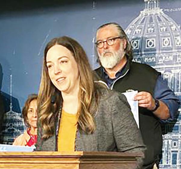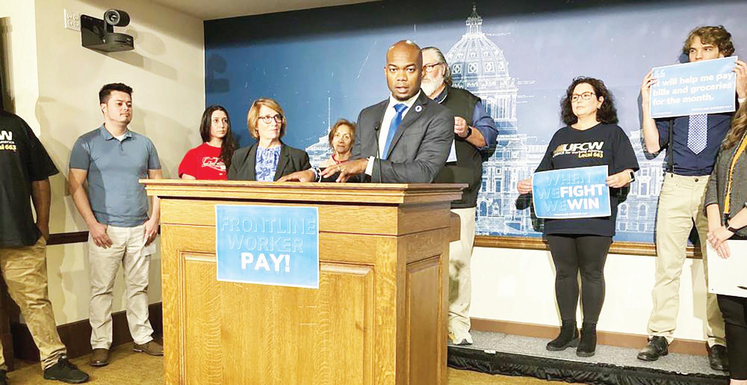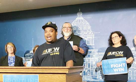 Keith Farr, a supermarket meatcutter and member of the United Food and Commercial Workers union, tells reporters at a news conference at the State Capitol in St. Paul, Minn., on Monday, Oct. 3, 2022, how the bonus payments going out to Minnesota frontline workers week will help him. The governor’s office on Monday announced that more than 1 million frontline workers have qualified for bonus checks to recognize their work during the COVID-19 pandemic. The payments will be $487.45 apiece.