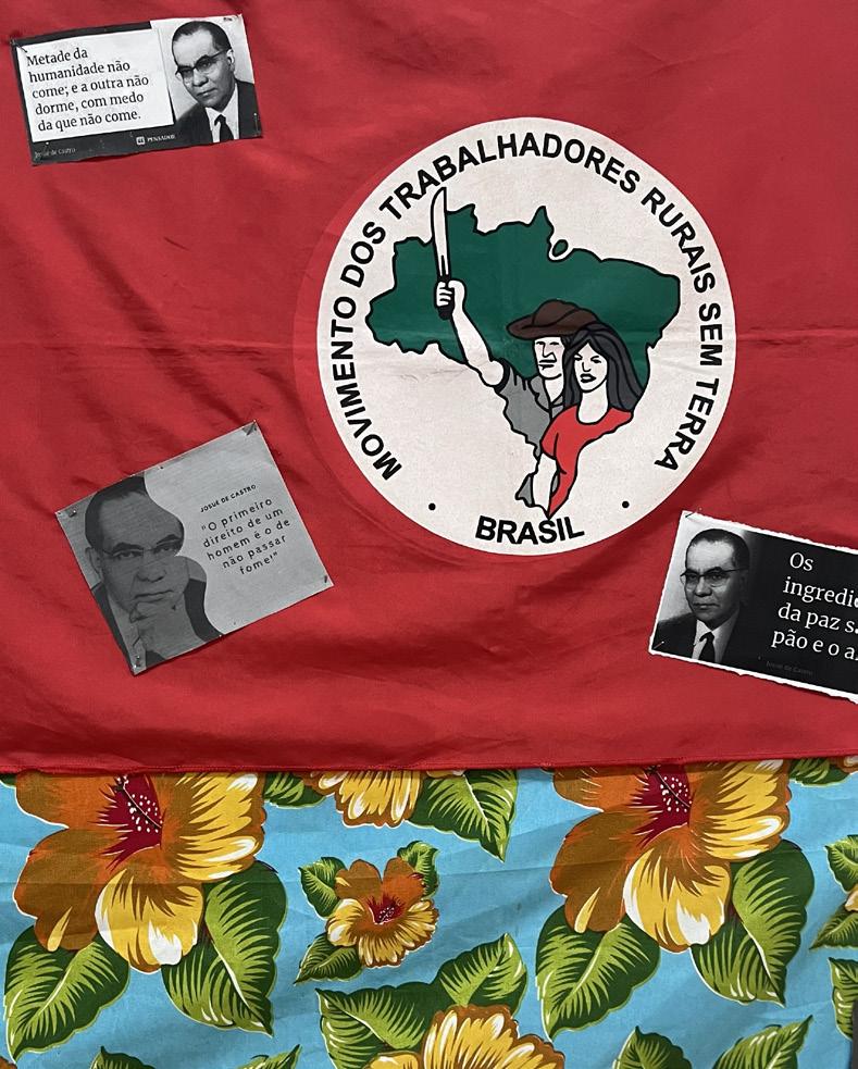 Na entrada da cozinha da escola Josué de Castro tem uma bandeira bem grande, na qual está escrito “COMER É UM ATO POLÍTICO” ao que imediatamente respondo em minha mente “ESCUTAR DÁ FOME”. Foi com essa frase que saí da escola após o primeiro dia de escutas, em 2023. Penso e reflito sobre a primeira escuta: quando perguntei a um aluno onde gostaria de ser escutado, ele escolhe a cozinha, lugar onde a luta do movimento ganha força, para fazer parte desse testemunho. Nesse momento, na cozinha, estamos entre muitos que persistem e desejam, através do fio da vida encontram uma forma de existir para além!