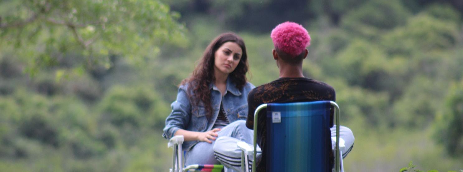 Estes encontros acontecem ao ar livre, nos espaços do assentamento (de frente para a lagoa, perto das hortas, na arena de teatro ou junto às árvores), sempre buscando silêncio e privacidade para garantir um ambiente seguro e confortável onde a palavra possa circular livremente. Antes da escuta, formamos uma roda com as cadeiras de praia no centro do pátio e convidamos os/ as/es adolescentes que têm interesse em serem ouvidos para sentarem conosco. Após os cumprimentos e as boas-vindas, cada adolescente escolhe um(a) analista disponível para o momento de escuta individual. Formadas as duplas, partimos para um local de preferência do “par analítico”, onde a escuta acontece.