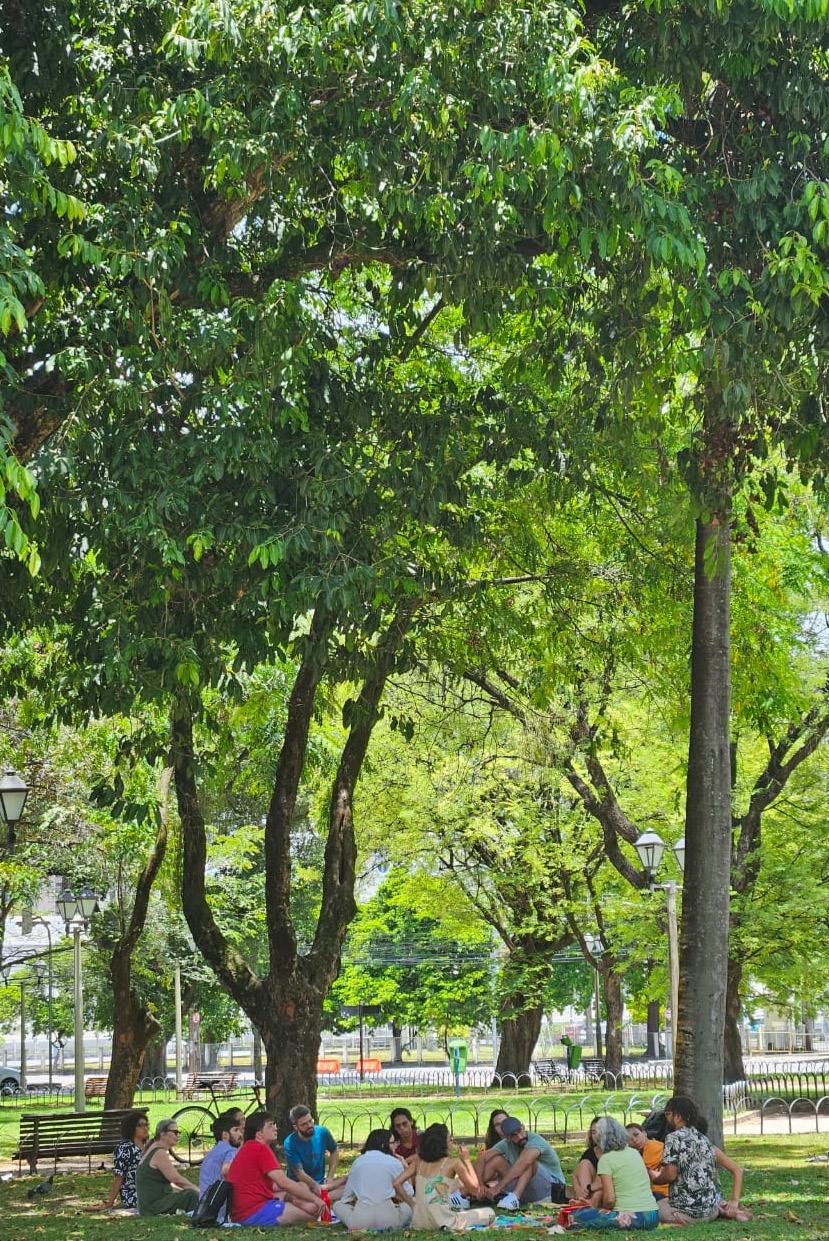 O caso das irmãs era diferente. Decidimos não responder de imediato e, em vez disso, compreender a demanda considerando a perspectiva racial. O tempo parecia ser algo precioso para nós naquele momento. Esse olhar interrogou o grupo em diversos momentos, convidando-nos a refletir sobre os motivos para um “sim” ou um “não”. Uma pessoa que busca ser atendida pelo coletivo e, ao estabelecer confiança e se sentir cuidada, traz a sua irmã para também ser escutada, é uma das contingências a que estamos submetides ao propor um espaço de escuta psicanalítica aberta e gratuita na praça. Foram necessários vários encontros para amadurecer essa reflexão, e, aos poucos, um corpo de pontos de vistas diversos e com pensamentos diferentes foi se formando. Percebemos que era necessário expandir os limites do que tradicionalmente