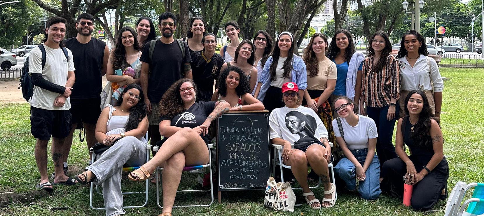 disponíveis para o atendimento, e vamos seguindo essa ordem à medida que pacientes vão chegando. Não escolhemos quem vamos atender, e também não são as (os) pacientes que escolhem. Foi acordado que a(o) analista que realizasse o primeiro atendimento do (da) paciente explicasse o nosso modo de funcionamento, que se dá em forma de Gira. A transferência, então, se daria com o coletivo, não com apenas um analista. E como nos reunimos todas as terças-feiras para a Escuta de Gira (sobre isso, ver: Andrade; Rodrigues; Araújo; Cavalcanti, 2024), todos os analistas estarão a par de todos os casos, dando a possibilidade da continuidade do tratamento. Não é uma contingência diante de alguma dificuldade do exercício pleno de uma clínica popular. Como se, por exemplo, não tivéssemos um número suficiente de pessoas analista. Trata-se de uma decisão coletiva e política de atender as pessoas na praça do Derby num sistema de Gira com vistas a discutir todos os casos coletivamente, onde não há “meu paciente” para o analista, nem “meu analista” para o paciente, que nos leva para uma compreensão do analista não mais calcado em apenas um indivíduo. Então, se a história da psicanálise é marcada por uma indissociação da teoria da clínica, o que estamos tecendo em nossa prática clínica é também teoria em cujo centro está a formação de um analista grupo.