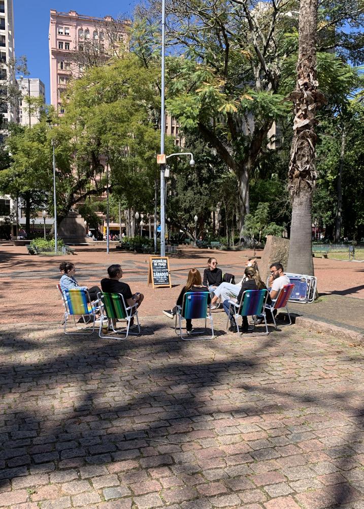 As cadeiras e os próprios bancos da praça compõem o dispositivo clínico em território. Além dos atendimentos individuais, também ocorrem escutas coletivas em formato circular, com a presença de mais de um analista, formando uma experiência compartilhada de escuta, quando assim os analisantes solicitam.