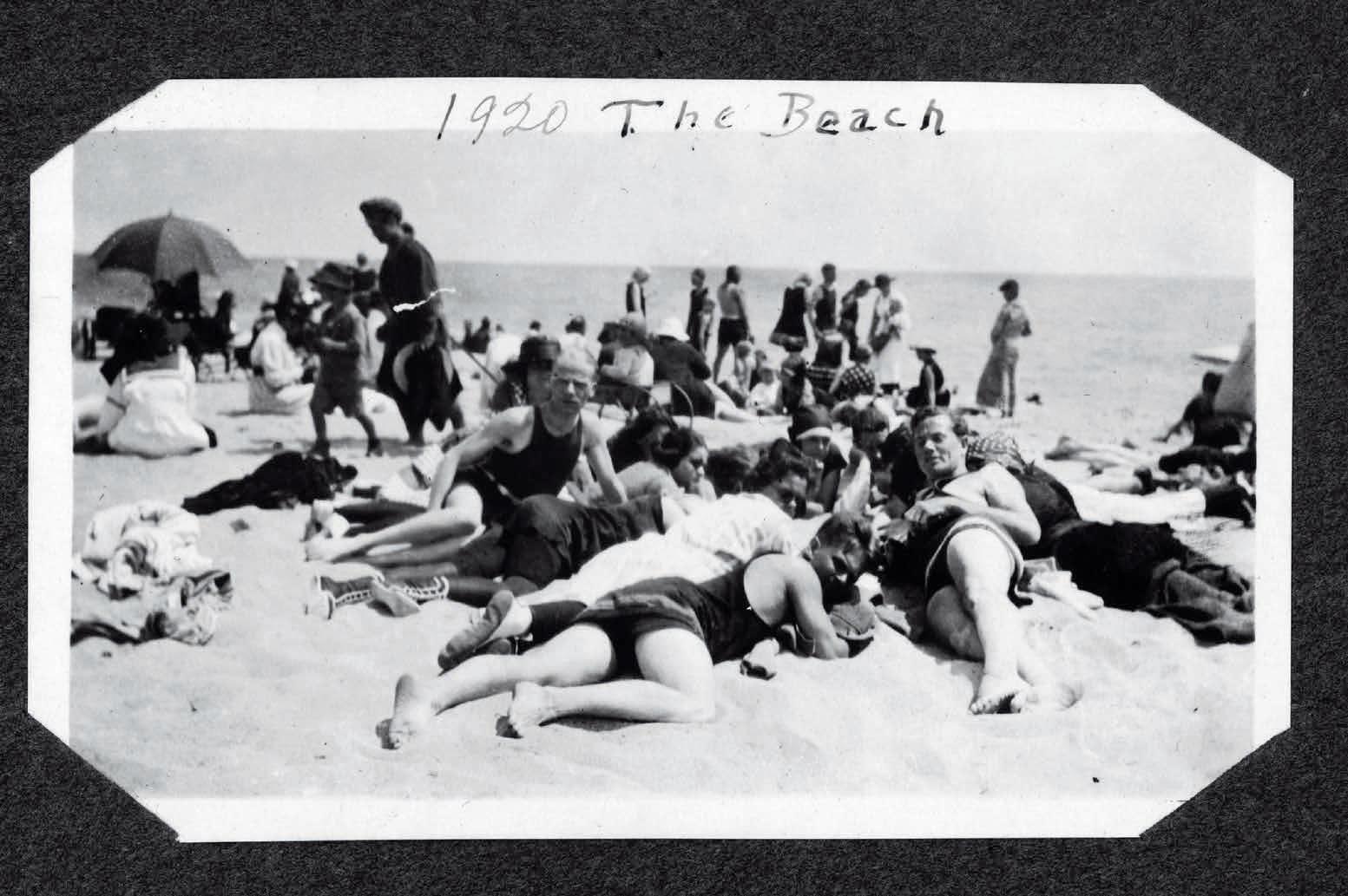 Margaret C. Baker in a bathing suit, seated on a brick wall near the ocean.