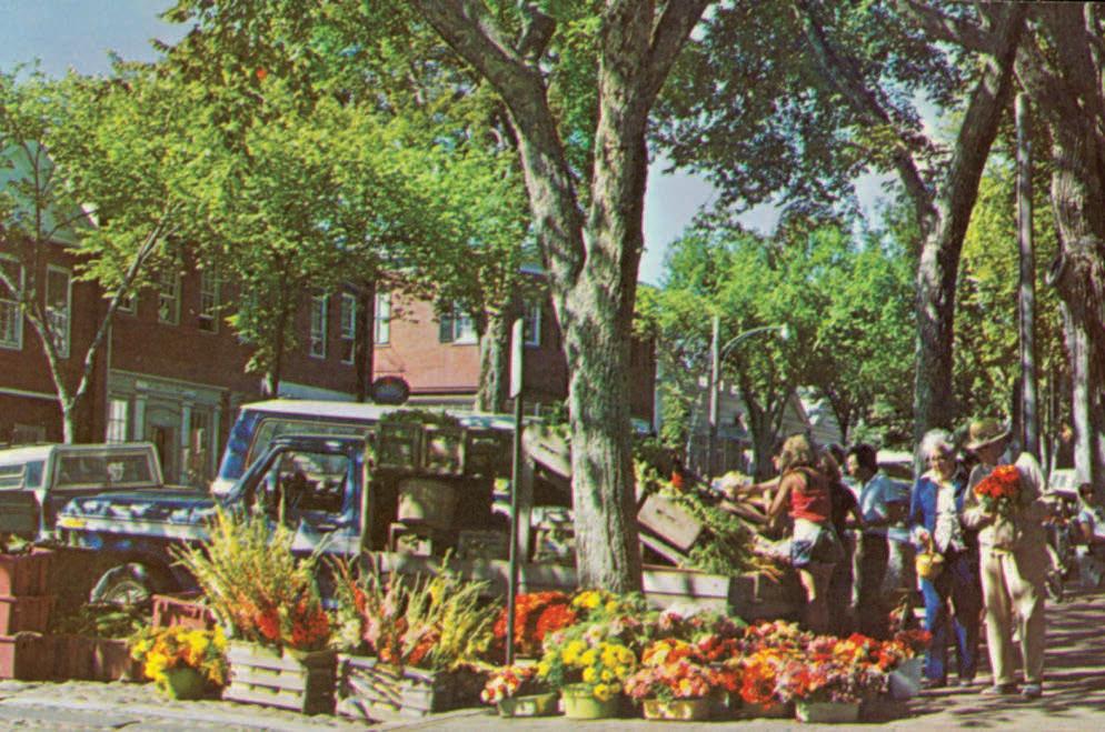 Bartlett’s Farm truck and a flower vendor on the north side of Main Street