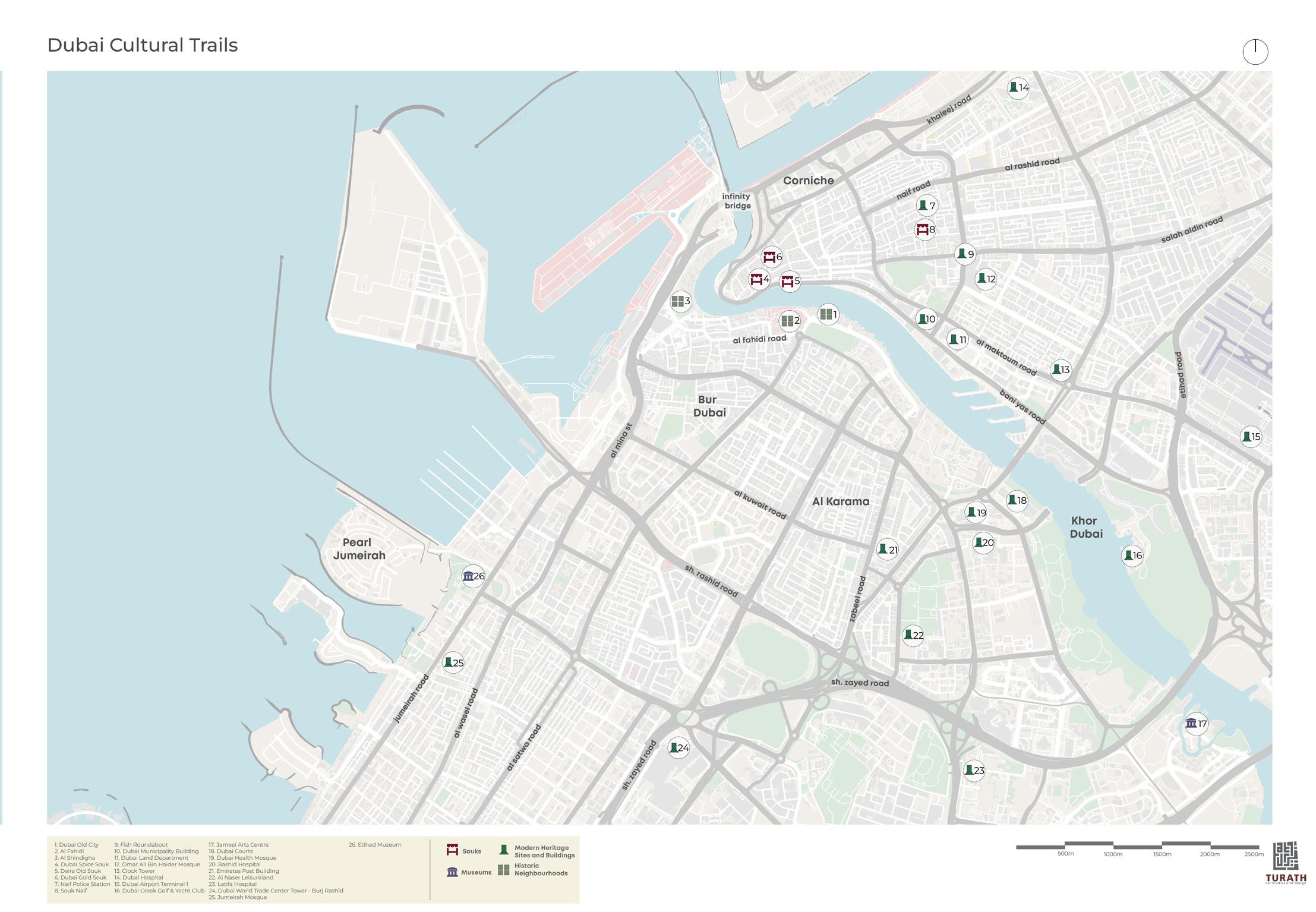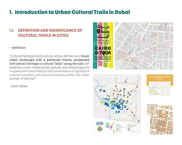 I contributed to the Dubai Cultural Trails project, where my responsibilities included researching the creation, implementation, and long-term maintenance strategies of cultural trails. I conducted in-depth case studies and produced a series of multi-scale maps to support trainees in developing their initial concepts for proposed trails across Dubai. The project aimed to enhance cultural tourism and promote local heritage by highlighting significant historical, architectural, and social landmarks through walkable, community-oriented routes. These
