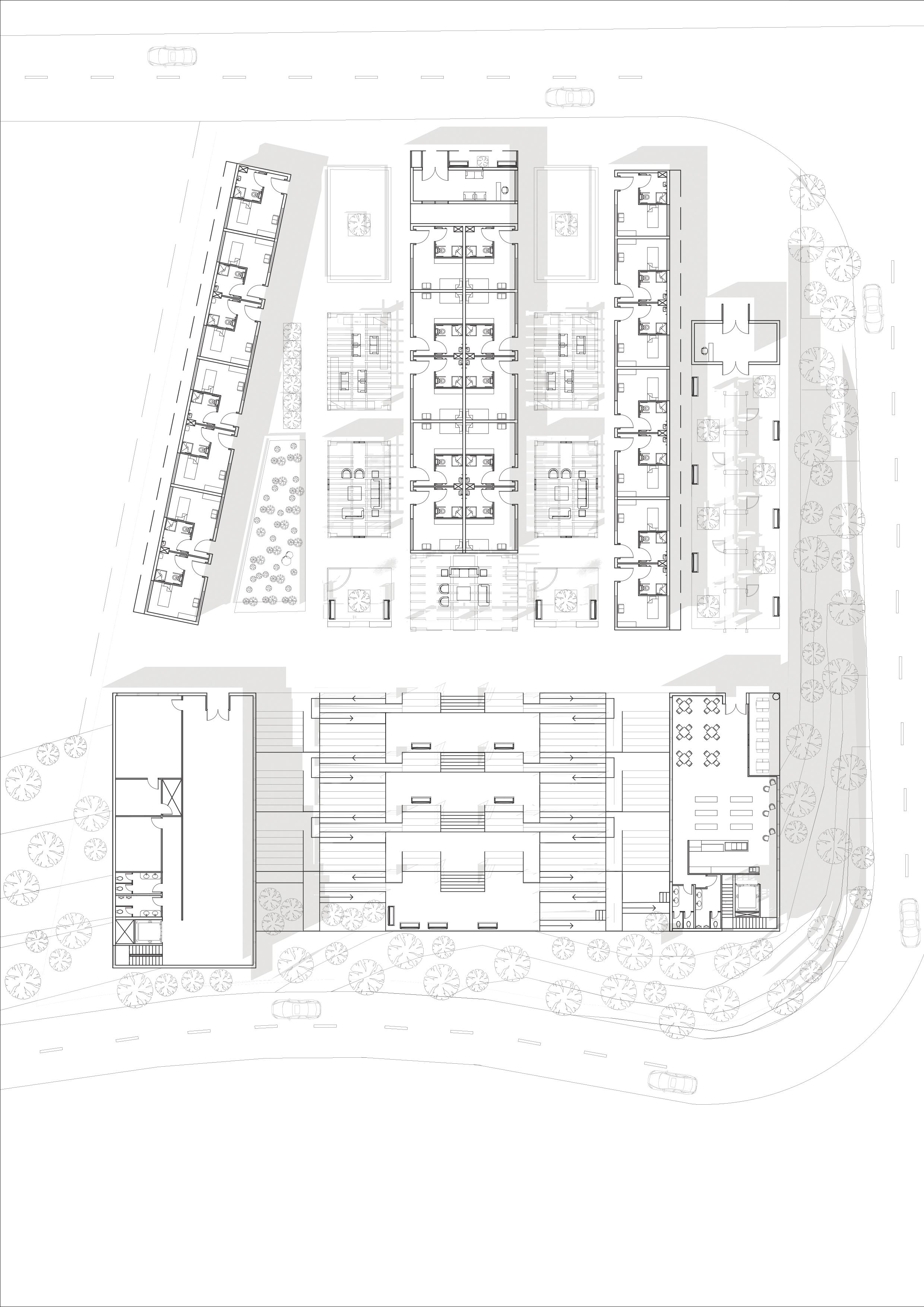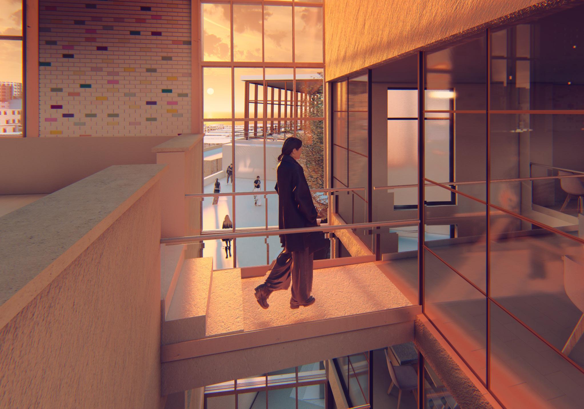 Additionally, the central courtyard is visible, acting as a unifying element across the project’s programmatic zones. Carefully placed vegetation has been integrated throughout the tight urban site to enhance microclimatic comfort and create a more inviting, dynamic environment.