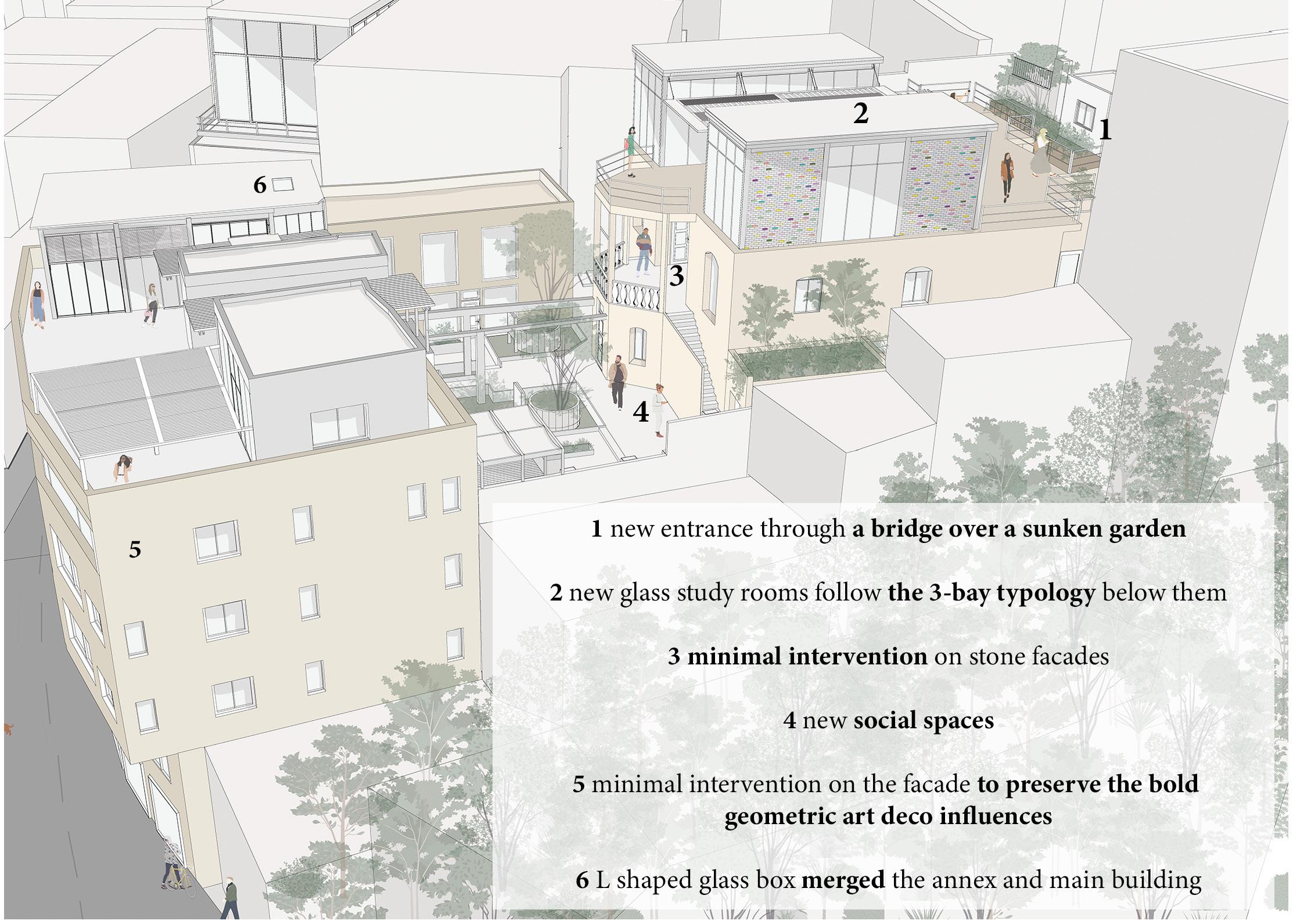 Key attributes include the mix of residential and commercial use, Art Deco features on the Strand façade, Art Nouveau-inspired interior textiles, the villa’s 3-bay typology, and the seamless integration with the sloped site. Structurally, I preserved the original post-and-beam and retaining wall systems, applying strengthening technologies with minimal façade intervention. Most changes were internal, particularly on the first two floors of the Strand, all grounded in theoretical research and contextual understanding.