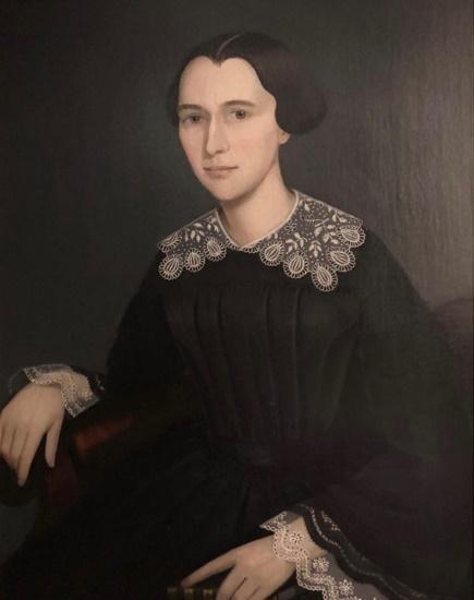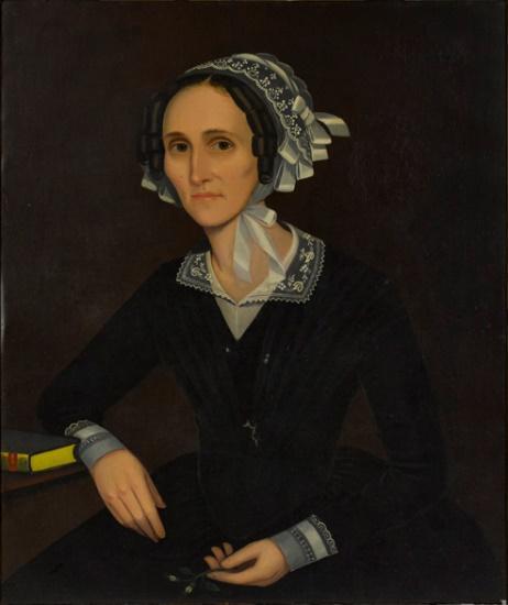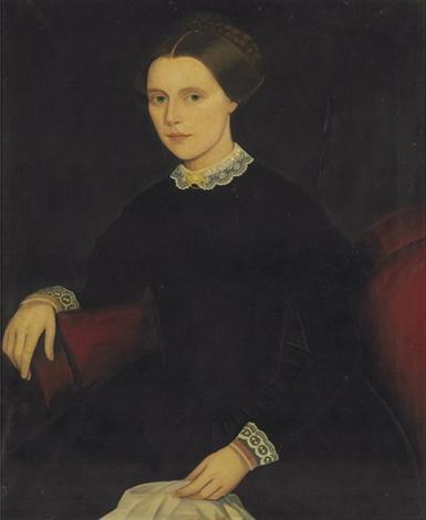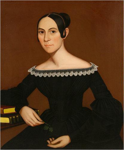 The portraits of this fully-developed period are characterized by somewhat lighter backgrounds of medium brown, boldly stylized black dresses with balloon sleeves, and women with a characteristic leaning posture, usually (but not always) to proper right on a small table, often with books. Curiously, Phillips mostly dispenses with furniture, other than the occasional sofa, and women of this period typically have no visible means of support. Women’s heads are sometimes unadorned, but are more often depicted with elaborate bonnets. The darkness of the women’s black dresses and men’s black jackets and stocks are boldly contrasted with broad white collars and white shirts.
