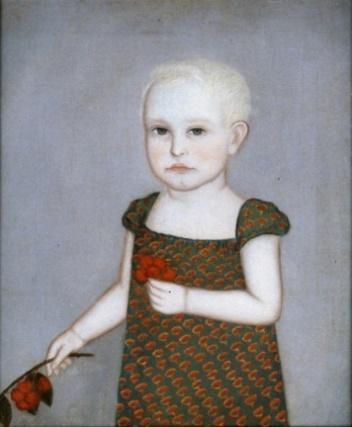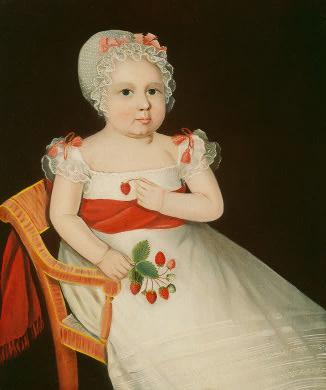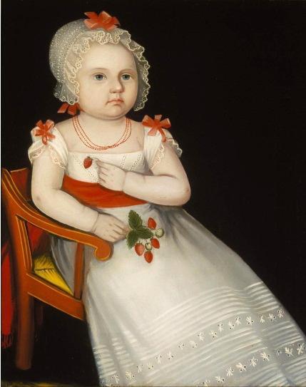 Of the three very similar portraits (middle row and lower center), the number of necklace strands may be a device to distinguish between related individuals. An examination of the number of strawberries held by the subjects of these and other portraits (e.g., John Younie Luyster) leaves little doubt that they represent the child’s age.