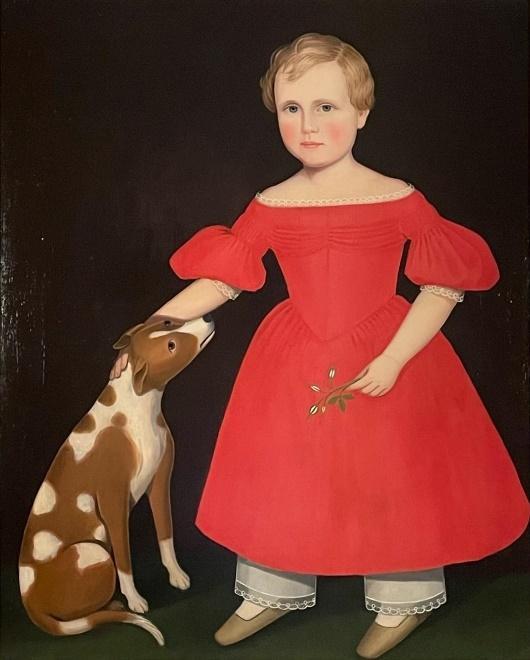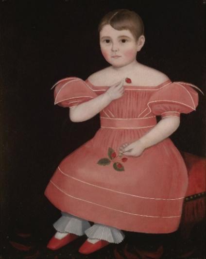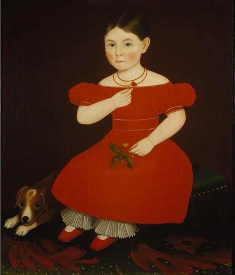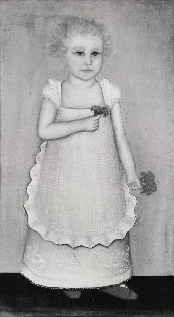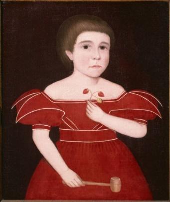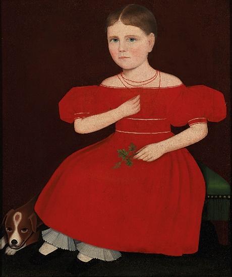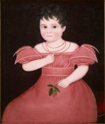Although shown on a single page for comparison purposes, this grouping may represent at least three periods. The fact that all nine are unidentified represents a mystery and a challenge. The first unidentified boy and girl (top row) from the Balken collection, now at Princeton, are likely the earliest. It has been suggested, from provenance, that the child with teething ring may be related to an unidentified man with quill from the Realistic period (midto-late 1820’s). The portrait of an unidentified child, aka “Hannah Standish”, bears an extremely close resemblance to the identified portrait of James Mairs Salisbury (born 1834). And the three similar portraits of young girls in red dresses with necklaces are also similar to the portrait of Andrew Jackson Ten Broeck which is dated 1834.