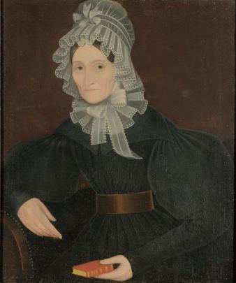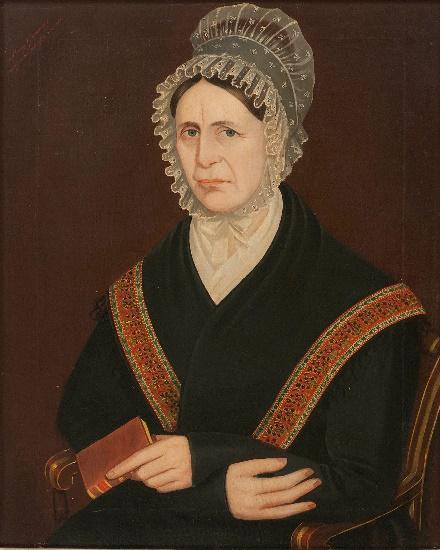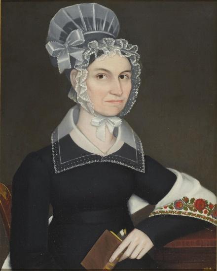 The Amenia portraits, although from a relatively brief period, are a large and cohesive grouping, and many of the subjects are from Amenia, Dutchess County, New York or nearby villages in northern Dutchess County. This seems to represent a peak period of productivity, when Phillips had a steady clientele in one small area. A characteristic element is a distinctively painted pillow-back chair which might have belonged to Phillips. A number of portraits also show Hitchcock-style chairs with gold stencils in various leaf patterns. There is evidence that Phillips may have used some of the commercially available decorative stencils directly on the canvas. In some, the subject appears to be gesturing toward the stenciling. Elaborate tall bonnets become the norm for female subjects of this period, each unique. A pose with long untied ribbons hanging one in front and one in back is also characteristic of the period. Several portraits are specifically dated to 1829 or 1830 from newspapers or letters in the subjects’ hands.