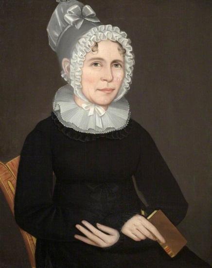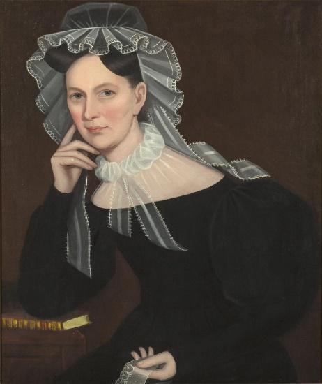 No abrupt change marks the boundary of Phillips’s “Kent Limner” or “Kent” period, which Mary C. Black more broadly defines as 1829-1838. Indeed the Amenia Portraits begin to show that exuberant style. Women’s bonnets often show a triangular shape, as though Phillips was struggling to fit them within the canvas. Women may also be depicted instead with a large ruffled collar or large trim to their neckline, their unadorned head showing off their fashionable “Apollo’s Knot” hairstyle. The effect is the same, with the bonnet or collar providing a stark contrast with the dark background and clothing, and highlighting the subject’s face. Gentlemen’s fashions include