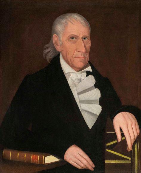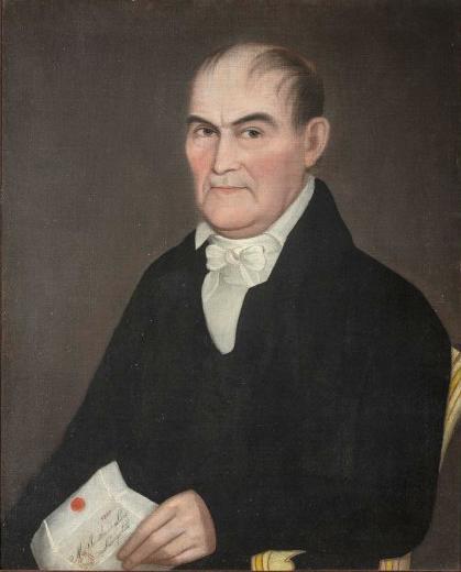 The earliest evidence of Phillips’s emerging classical style is the bust-like depiction of N.B. (Napoleon Bonaparte) Buell dated 1818. Both the portraits of Rev. Gabriel Gebhard and Anna Maria Magdalene Carver Gebhard of Claverack, Columbia County, New York are inscribed with the subjects’ names, “1820” and “Painted by A. Phillips” and “Delineavit A. Phillips”, respectively. Two portraits signed and dated 1821 are Dr. John McClellan and Jonathan Lane, both of Livingston, Columbia County, New York, the latter inscribed “by Mr. Ammi Phillips of Troy.” The portrait of George Selby holding a letter addressed to him in Albany, New York may in fact have been painted at the time of his marriage in May 1821, possibly at Schodack, Rensselaer County, New York.