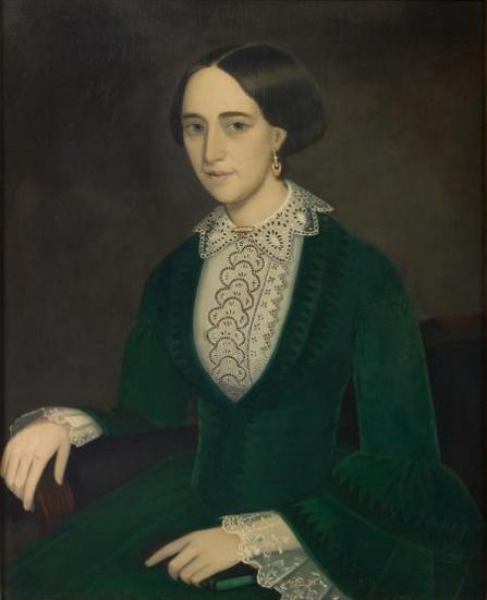 The portraits of the late 1830’s and 1840 use a reliable formula, somewhat more restrained than the most exuberantly stylized portraits of the mid-1830s. Gentlemen are depicted in what almost appears as a standing pose. Women’s headwear is less elaborate, or absent, and the poses with close-together hands and frequent use of small books are less imaginative. A distinctive prop of this period is a small table covered in green leather with brass tacks.
