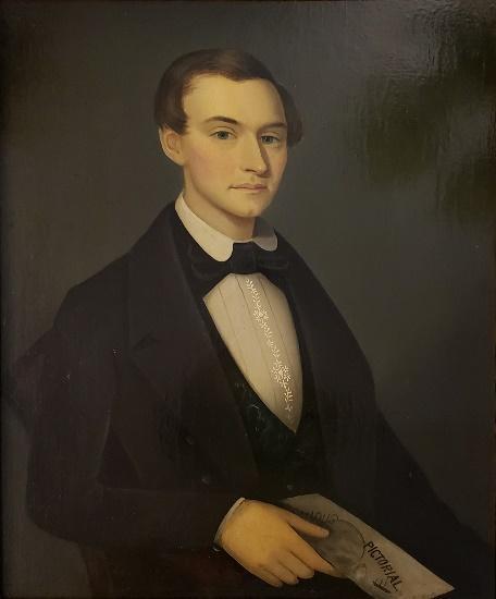 It is in this period that Phillips employs the device of a shawl wrapped around the female subject’s arm. These include subjects in black dresses with a white shawl with green floral border, and the striking portraits of women in white dresses with a red shawl similarly arranged. Gentleman of the period are shown in both bust-like portraits, sans hands, and in more casual poses involving fancy-painted and bamboo-painted chairs and holding books. The portrait of Daniel Bull (related by marriage to the Thompson family) shows the deeply half-shaded facial depiction which is characteristic of Phillips’s Realistic period.