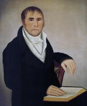 The earliest indicators of Ammi Phillips’s professional activity are his advertisements as a portrait artist in Pittsfield, Berkshire County, Massachusetts in 1809 and 1810. No works are specifically known from these years, however the portrait pair of Patience Bolles Stoddard and Ashbel Stoddard, of Hudson, Columbia County, New York, may date as early as 1810. He is holding a copy of Washington’s Farewell Address in quarto, which was published in that format only in that year.