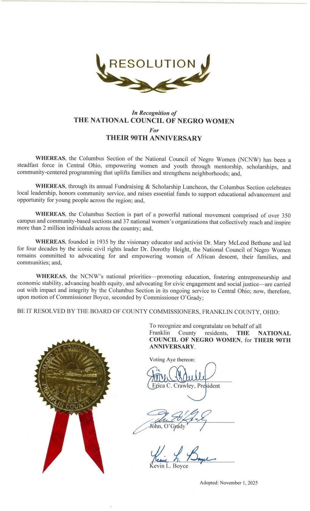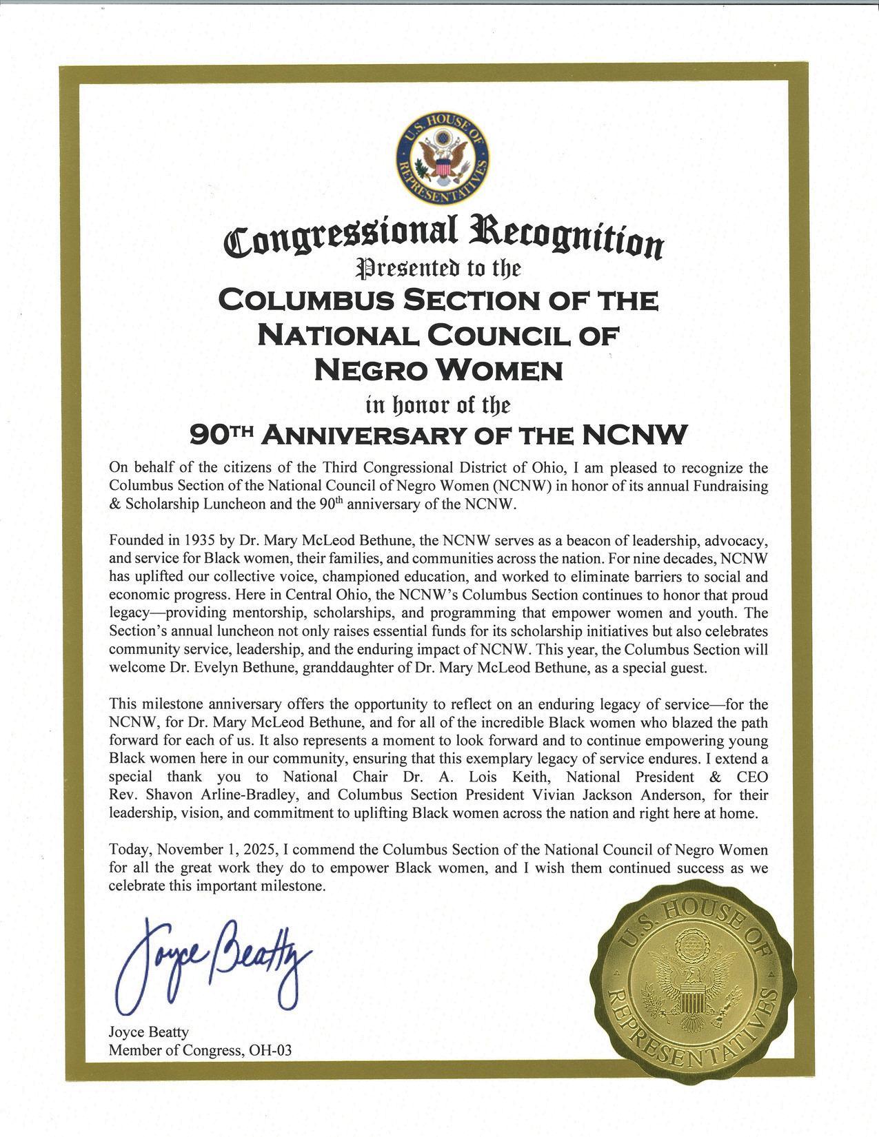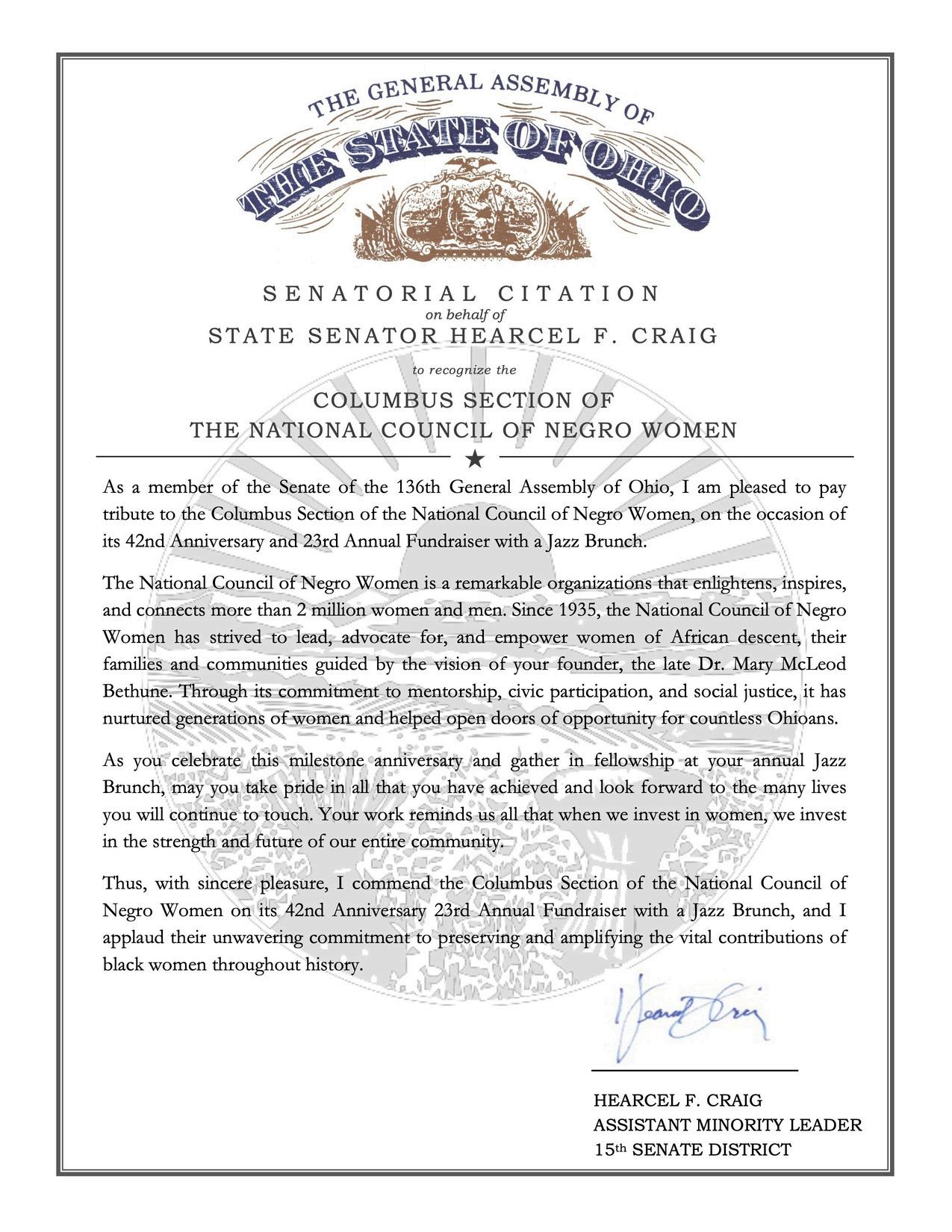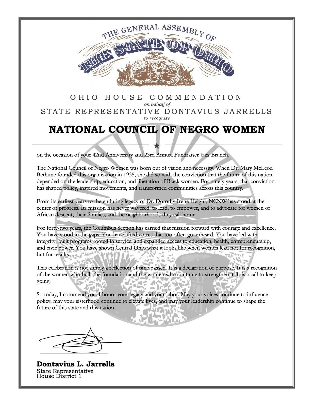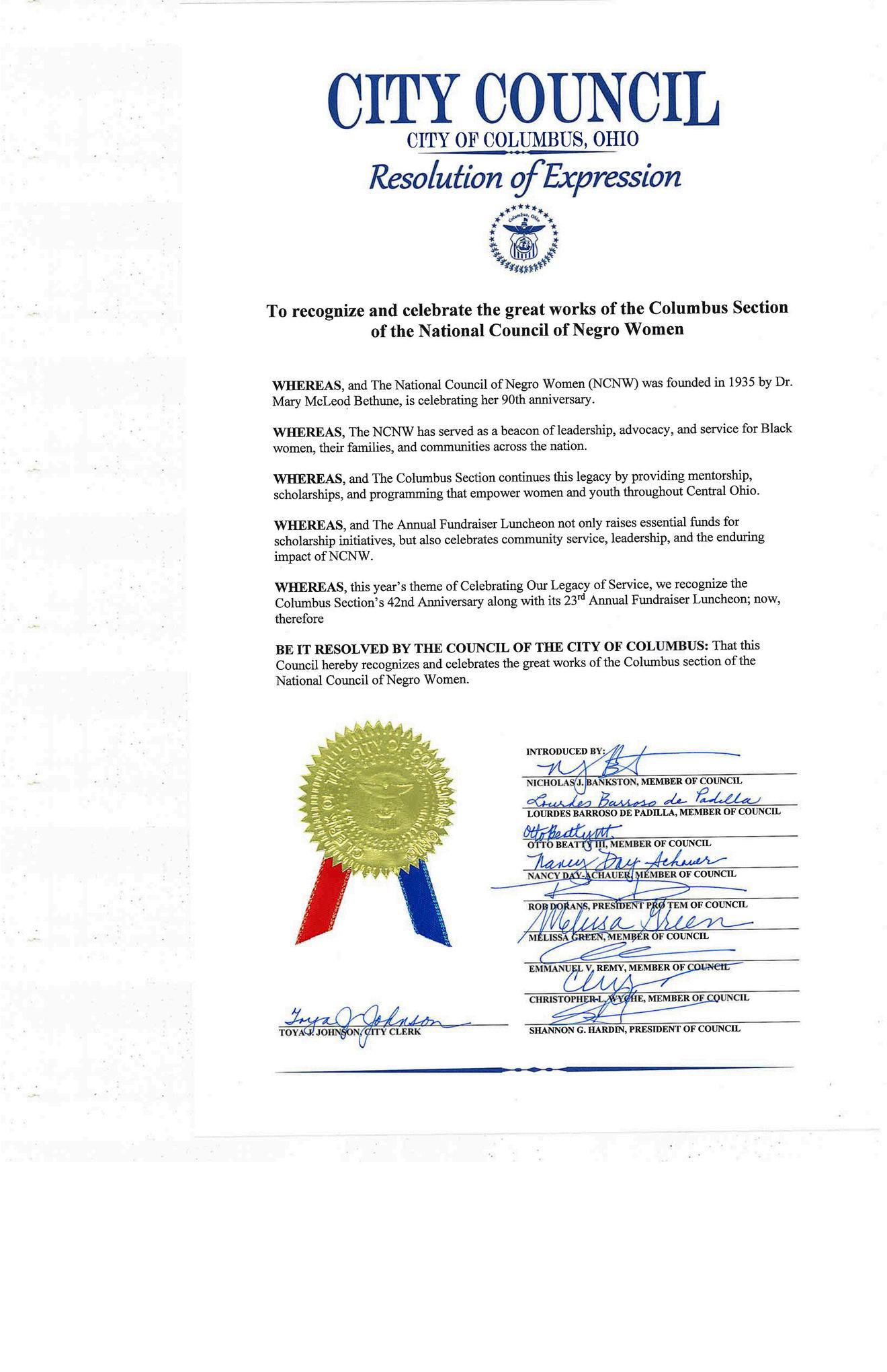 Finally, the Columbus Ohio Section, of the National Council of Negro Women Incorporatedhascontinuallynurturedandworkedtohelpeducateouryoungpeople lives.BestwishestoawellgroundedandgrowinglocalsectionwithintheOhioState Coalition,andtheStateofOhio.
