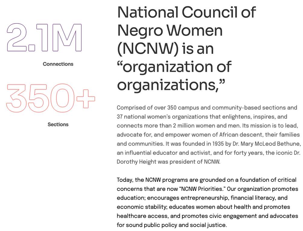 AcrossthestateofOhioandthenation,NCNWSectionsaremakingan unprecedenteddifferenceinthecommunitieswheretheylive,work,play, andworship.Committed,Blackwomenwithavisionutilizetheirvoicesto expressvalueswhilebeinggroundedinpurpose-service.