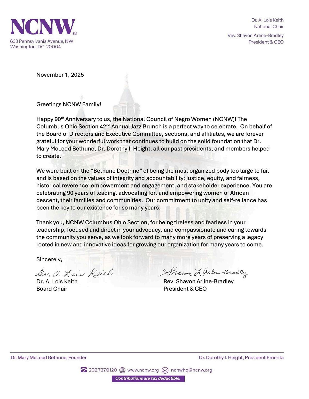 Wearetheproudinheritorsofavisioncastbyour founder,Dr.MaryMcLeodBethune,whostated,“Faith isthefirstfactorinalifedevotedtoservice.Withoutit,nothingispossible. Withit,nothingisimpossible.”Itiswithfaiththatweserve“tolead,to develop,andtoadvocateforwomenofAfricandescent,theirfamilies,and community.”Asweupliftwomen,familiesareempoweredand communitiesaretransformed.