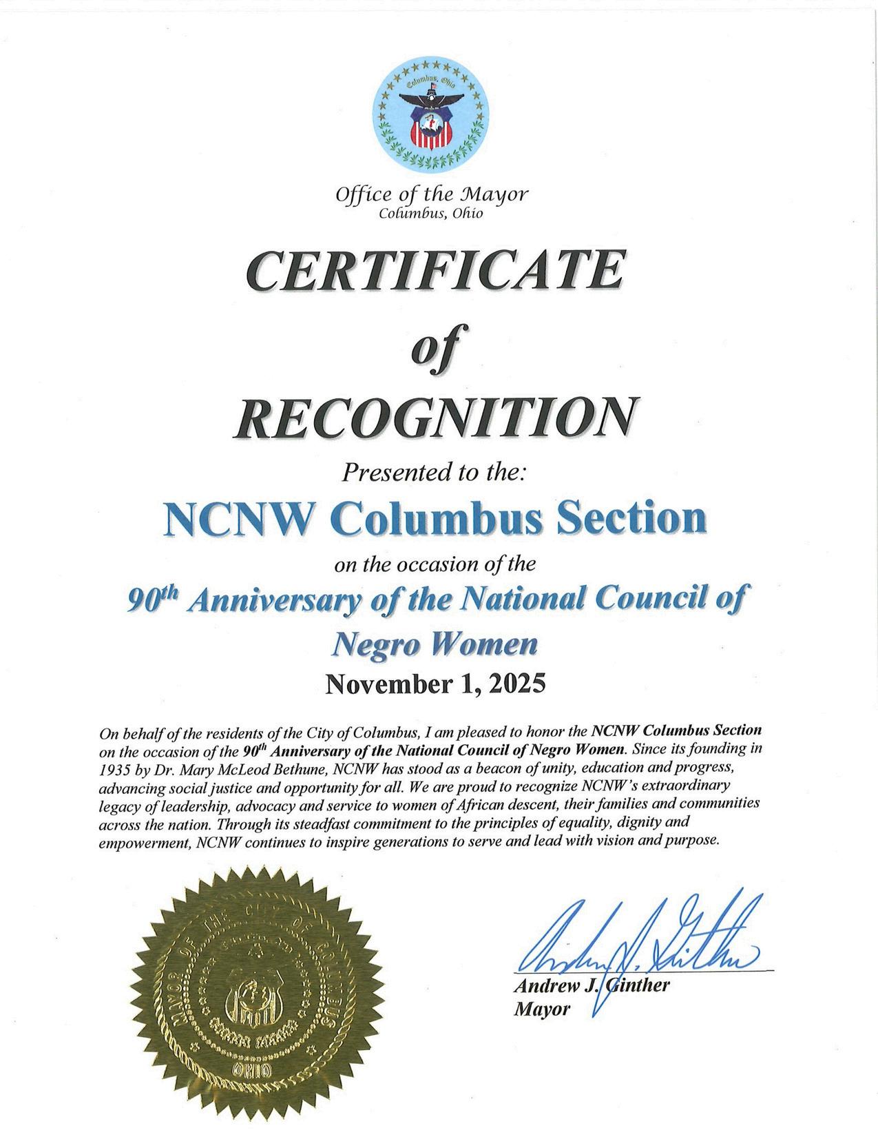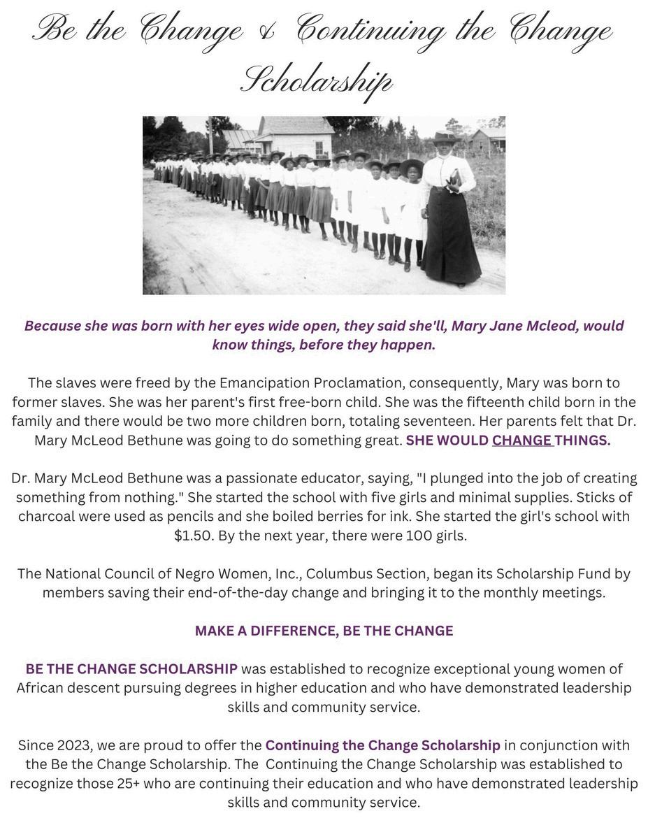 NCNWcelebrates90yearsofserviceexcellence.Withthisasourlegacy,we boldlystepintoourfuture.‘Thejourneyofathousandmiles(or90more years)beginswithasinglestep.Whatisbeforeuswillchallengeour resolveanddemandourbest.Thesistersrelyonfaith,Dr.Bethunespokeof, andasaconsequence,leadwithcourage,servewithgrace,showmercy, andbuildwithsteadfastlove. ThephenomenalwomenintheColumbus Sectioncontinuetomakehistory,asweindividuallyandcollectivelylive herstory.