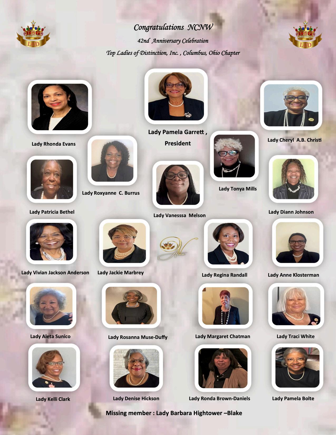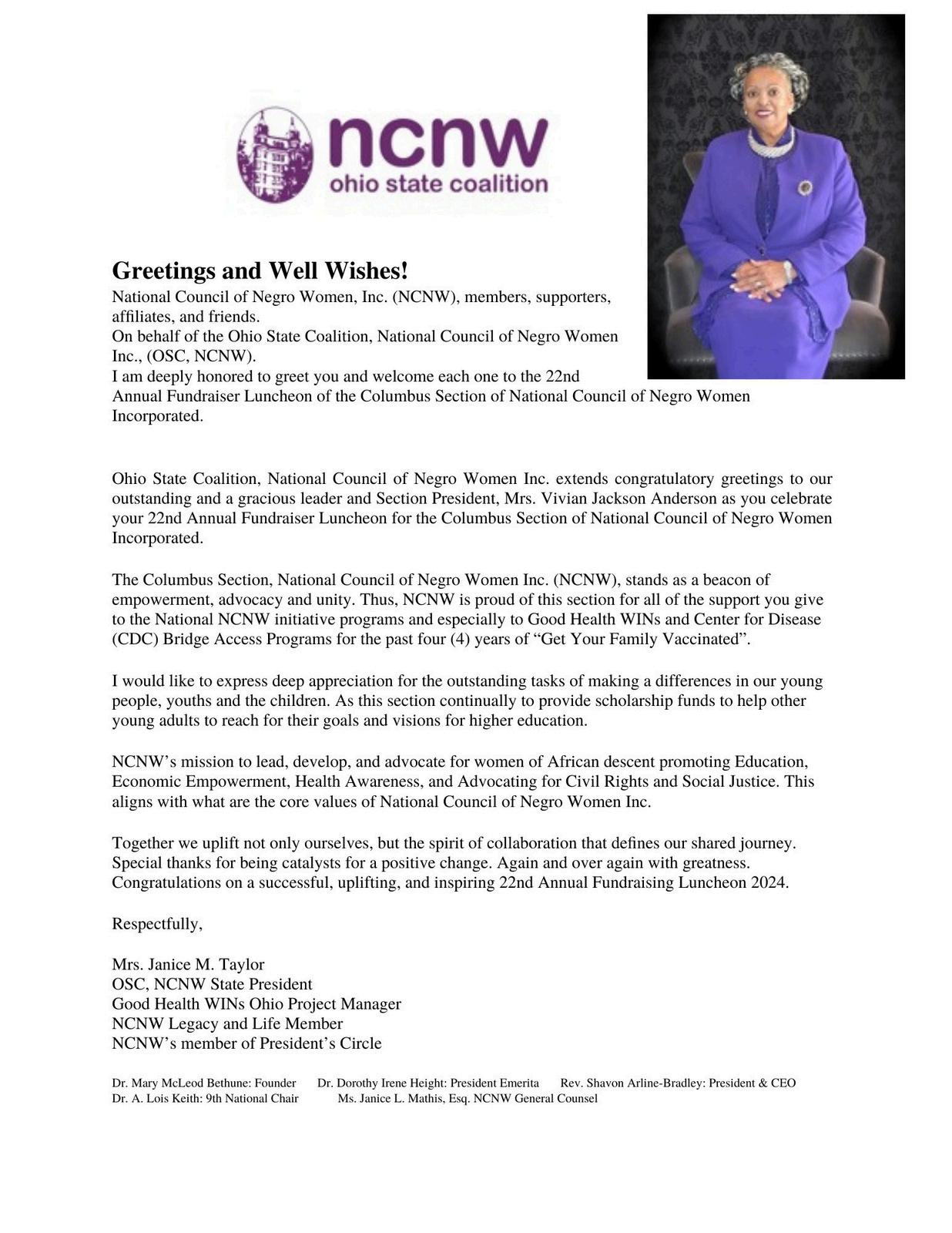 Overforty-twoyears,theColumbusOhioSectionofNCNWhasstrivedtoretain,to maintainandtorenewtheirmembershipsforthepastyearsofservices.Theleadership for the Columbus Ohio Section, NCNW Inc. has been profoundly extraordinary, respectful,dedicated,andcommitted.Today,wearesalutingourcurrentColumbus OhioPresident,Mrs.VivianJacksonAndersonandourofficersandfrommembers, ColumbusOhioSectionofNCNW,Inc.Weallshallsaluteeachoneandwearegrateful fortheirloyaltyandleadership.