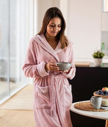 1: Kupaonski ogratač Day, vanjski materijal 100% pamuk, unutrašnjost 80% pamuk/20% poliesterska vlakna, boja: bijela, plava, ružičasta, s prugastim dekorom na kapuljači, rukavima i džepovima, perivo do 60°C, veličine od XS do XL (33551065/01-15)