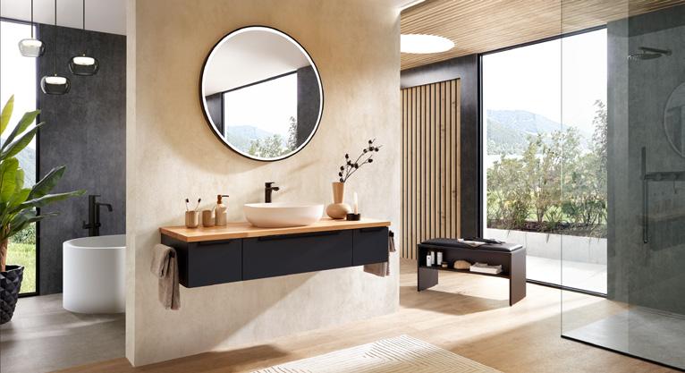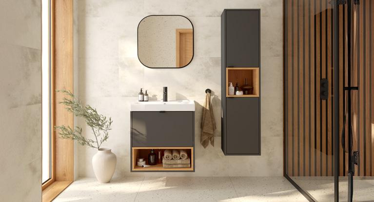 Kupaonica Open, boja: antracit siva/dekor hrasta, element s umivaonikom, keramički umivaonik, 1 ladica, 1 polica, dim.: 62x66,5x46 cm, visoki element, dim.: 35x150x33 cm. (08380047/01-02)