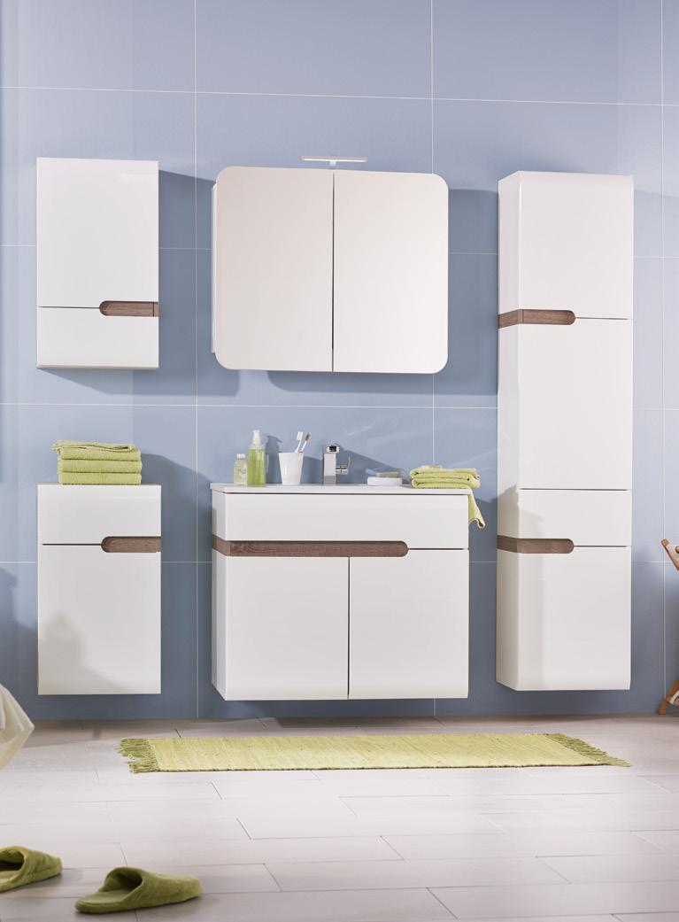 Kupaonica Linate, MDF, boja: bijela visoki sjaj/dekor hrasta, element s umivaonikom, keramički umivaonik, 2 vrata, dim.: 81x68,5x48 cm, element s ogledalom, 2 vrata, s LED rasvjetom en. razreda A-A++, dim.: 80x69x16 cm, gornji element, 1 vrata, dim.: 40x68,5x22 cm, donji element, 1 vrata, 1 ladica, dim.: 40x68,5x31 cm, visoki element, 2 vrata, 1 ladica, dim.: 40x176x31 cm. (18030626/01-05)