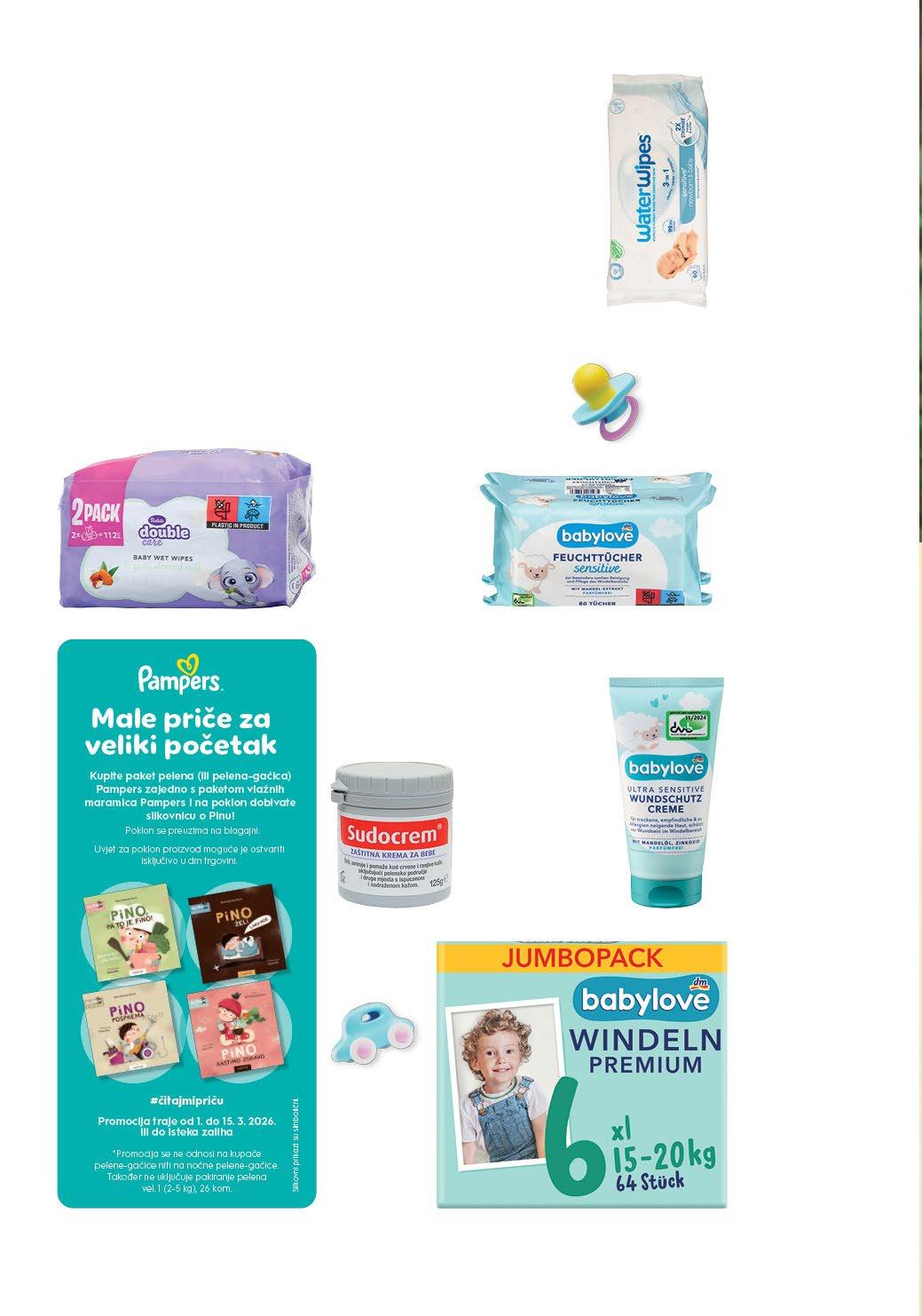 * Promocija traje od 1.3. do 31.3.2026. Ne odnosi se na kupnju dm darovnih kartica, povratnu naknadu za ambalažu s jednokratnom upotrebom te početne i specijalne dojenačke formule. Ne odnosi se na početne i specijalne dojenačke formule, dječje igračke, slikovnice, dječji tekstil, dječje poklon-pakete, sredstva za pranje rublja i posuđa, inhalatore te ušne toplomjere.