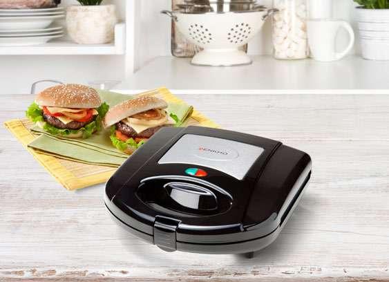 S 3 izmjenjive neljepljive ploče: rebrasta za pečenje na roštilju, četvrtasta za vafle, trokutasta za tost, uklonjiva radi lakšeg čišćenja, snaga 650-780 W.