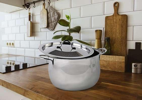 Kapacitet 4,5 l, nehrđajući čelik, perforirani poklopac koji se spaja, pogodan i za indukcijske ploče.