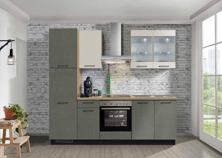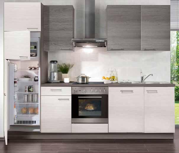 3: Kuhinjski blok s aparatima Plan, lijevi ili desni, dekor sivi hrast/bijeli hrast. Dim.: 280 cm. U cijeni kuhinje uključeni su aparati Dalbach: staklokeramička ploča za kuhanje KFH6001, pećnica HE-01/A, hladnjak s ledenicom KGK145-E/F, perilica posuđa GS60V-0B/F, napa UBH60-01/D i sudoper ZSP78X. (18710032/1G,2D)