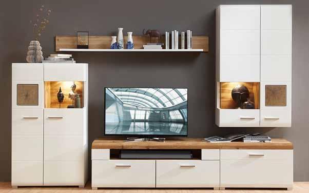 4: Regal za dnevni boravak Fun Plus, boja: mat bijela/ dekor hrasta, dim.: 320x205x47 cm, meko zatvaranje, LED rasvjeta en. učinkovitosti A-A++ uključena u cijenu. (27370315/01)