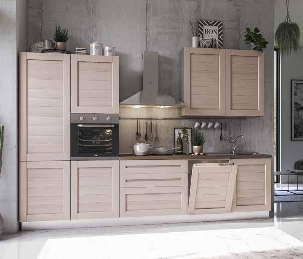 2: Kuhinjski blok s aparatima Elettra Canapa 330, lijevi ili desni, fronte masivno drvo jasen, boje pijeska, radna ploča: smeđa, dim: 330 cm. U cijeni kuhinje uključeni su aparati Beko: staklokeramička ploča za kuhanje HIC64401, pećnica BBIE12100X/A, hladnjak s ledenicom BCSA285K4SN/E, perilica posuđa BDIN25320/E, napa Elica Certosa 90/E i sudoper
