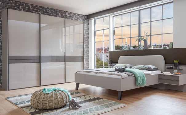 1: Spavaća soba Monza , boja: svijetlo siva. Set krevet i 2 noćna ormarića , krevet s tapeciranim uzglavljem u izgledu kože, dim.: 180x200 cm, vanjske dim.: 189x218 cm, 2x noćni ormarić dim.: 60x48x43 cm. Podnica, madrac, rasvjeta uzglavlja i panel noćnih ormarića uz nadoplatu. Ormar s kliznim vratima , staklena fronta, 3-krilni, dim.: 250x217x67 cm. Uz nadoplatu dostupan velik izbor elemenata kao: ukrasni okvir ormara bez ili s rasvjetom, police, rasvjeta polica, šipke, unutarnje ladice, unutarnja raspodjela, držači kravata, hlača i obuće, lift šipka, klupa, komode i dr. (04420286/01,07) 999,0