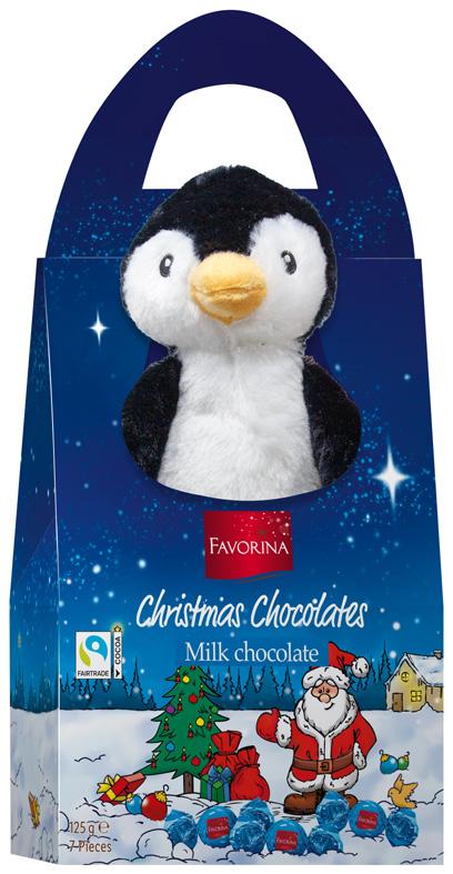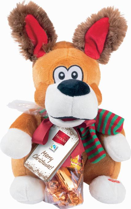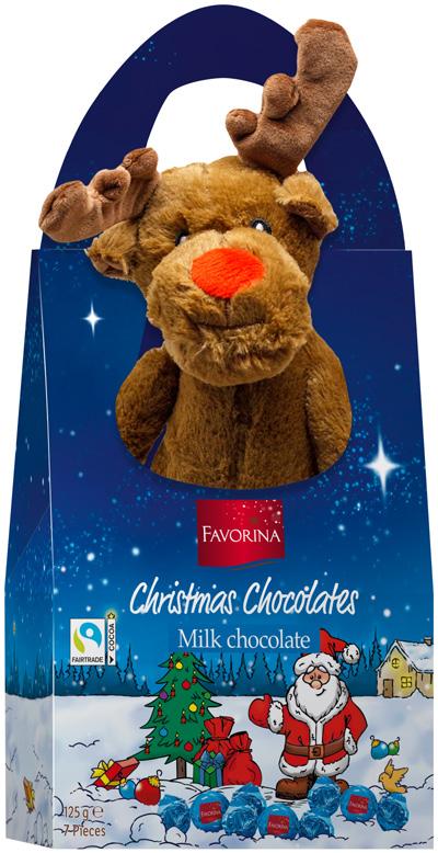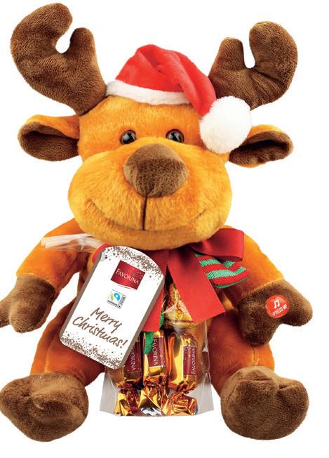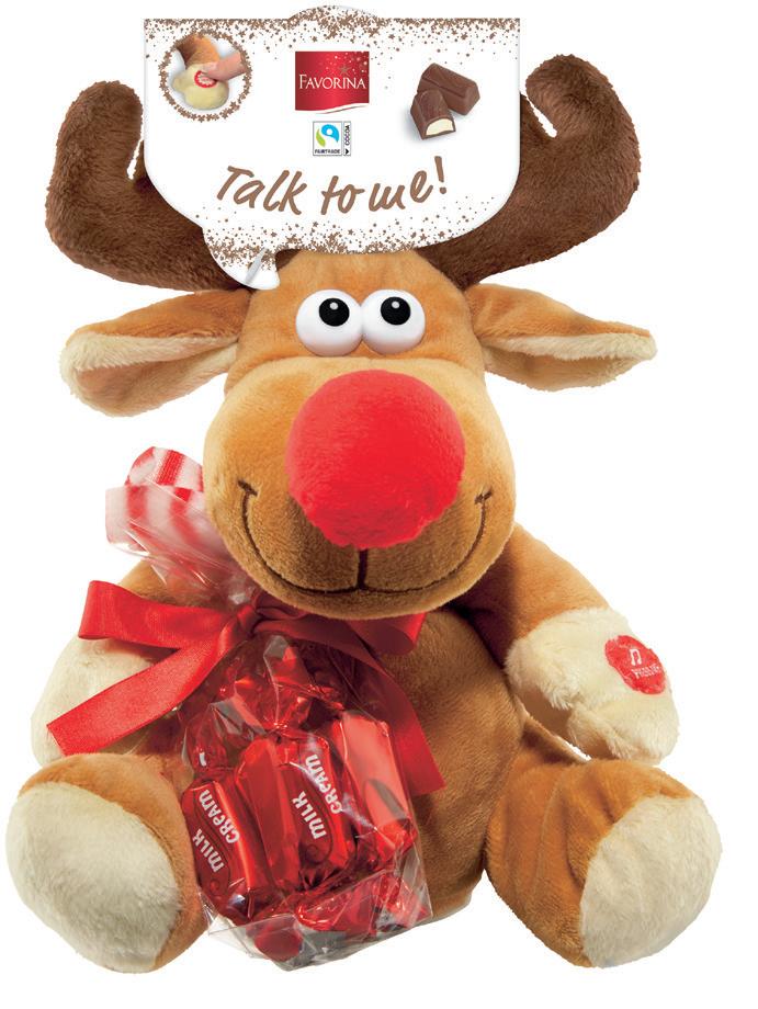 • Sadrži vrećicu sa 79 g čokoladica Favorina Pričajući los Plišana igračka koja ponavlja izgovorene reči Sa 40 g mlečnih čokoladica