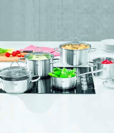 20: Set lonaca za kuhanje Toronto 5/1, set sadrži: 5 lonaca različitih veličina i 4 staklena poklopca, nehrđajući čelik 18/10, matirano, supertermalno dno, s mjernom skalom i rubom za jednostavno izlijevanje, pogodno za sve vrste štednjaka i perilicu posuđa. Gnječilica za krumpir + guljač nehrđajući čelik, pogodno za perilicu posuđa. (37240080;39320192)