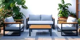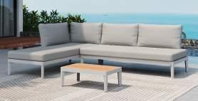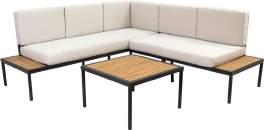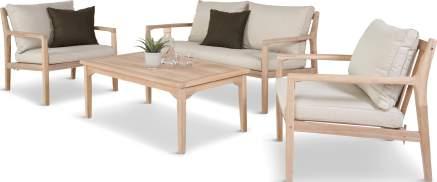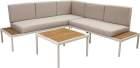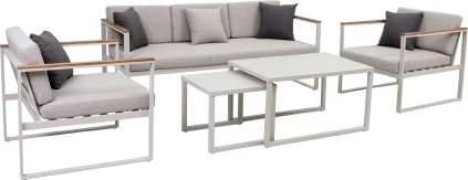 sastoji se od trosjeda d 67,5 x š 205,5 x v 77 cm, dvosjeda d 67,5 x š 142 x v 77 cm i stolića d 67,5 x š 67,5 x v 40,5 cm, praškasto lakirana aluminijska konstrukcija / tikovina, bež / crna ili boja pijeska (dostupno isključivo putem webshopa), uklj. olefinski jastuci za sjedišta i naslone 699,- € npr. 32111613