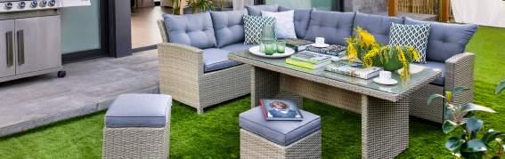 sastoji se od trosjeda s naslonima za ruke d 178 x š 78 x v 84 cm, ravnog trosjeda d 206 x š 78 x v 84 cm, dva taburea d 41,5 x š 41,5 x v 37 cm i stola d 151 x š 78 x v 84 cm sa staklenom pločom deb. 5 mm, aluminijska konstrukcija / pletivo od umjetnog ratana, antracit / siva, uklj. jastuci za sjedišta i naslone 26351625